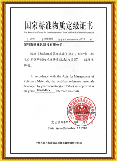 國(guó)家標(biāo)準(zhǔn)物質(zhì)定級(jí)證書(2007年)